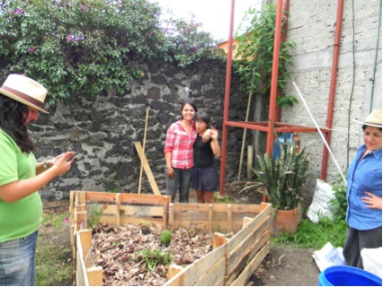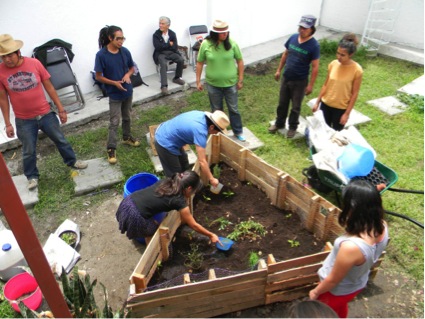 Para entonces todos estábamos ansiosos de comenzar con el trasplante. Los primeros en habitar nuestra cama de cultivo fueron un par de jitomates que germinaron inesperadamente de nuestra lombricomposta, además de una planta de lechuga, tomillo, romero, hierbabuena, cebollín, rábanos, varias plántulas de alubias y un par de dientes de ajo. Todos tuvimos la oportunidad de poner a las plantas en su nuevo hogar y para mantener la humedad del suelo, agregamos una delgada capa de hojarasca seca en la superficie.