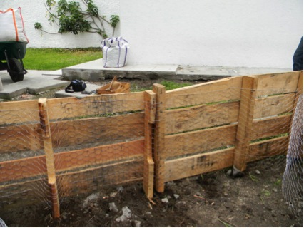 Una vez construido el contenedor, le colocamos malla de alambre de gallinero por dentro con ayuda de una engrapadora y alambre, para evitar que se saliera parte de la hojarasca por los huecos que quedan entre las maderas de los palets.