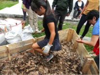 En ese momento llegaron más personas a ayudar, ya éramos cerca de 20 y llegábamos a una de las partes más divertidas del día: la hora de sembrar. Pero primero vaciamos las bolsas de hojarasca en el contenedor, para crear un sustrato de al menos 40 cm, para lo que realizamos lo que denominamos la danza de la hojarasca, pues había que compactar las hojas y el mejor método es ponerle ritmo y entrar a bailar para compactar el sustrato.